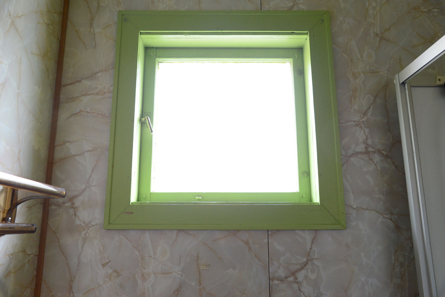 - Det gamle badet hadde veggplater og vindusinnramming i grønt.
