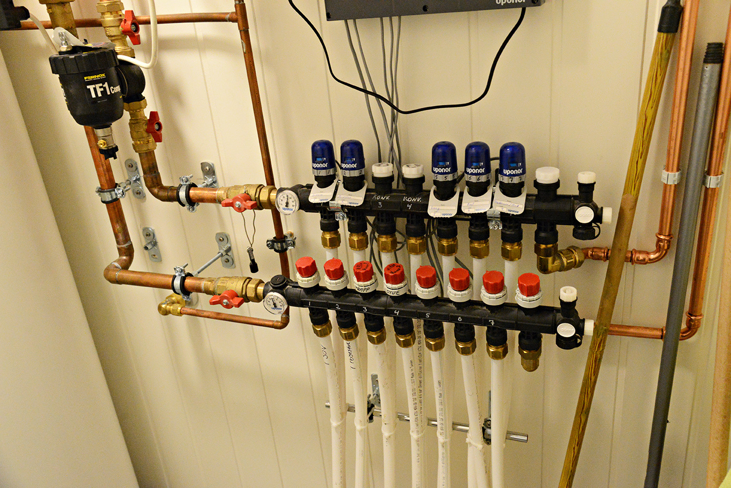 - Mange rør og koblinger må til når man installerer vannbåren varme.