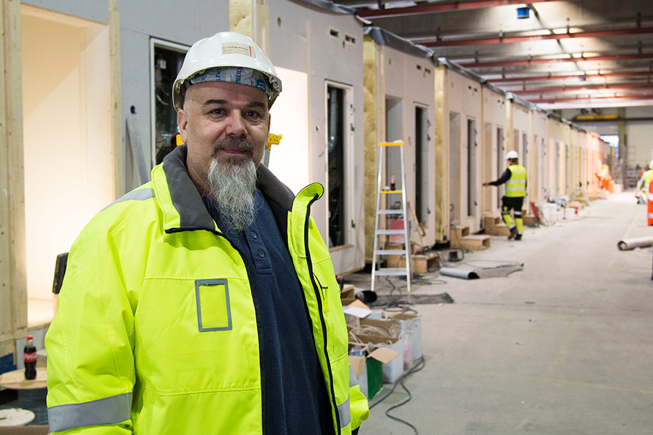 Inne på Husfabrikken jobber blant andre Tor Morten Gartland Rømo for tiden. Han fester røropplegg på yttersiden av sjaktvegger som skal bli til selve inngangen til hver enkelt celle.