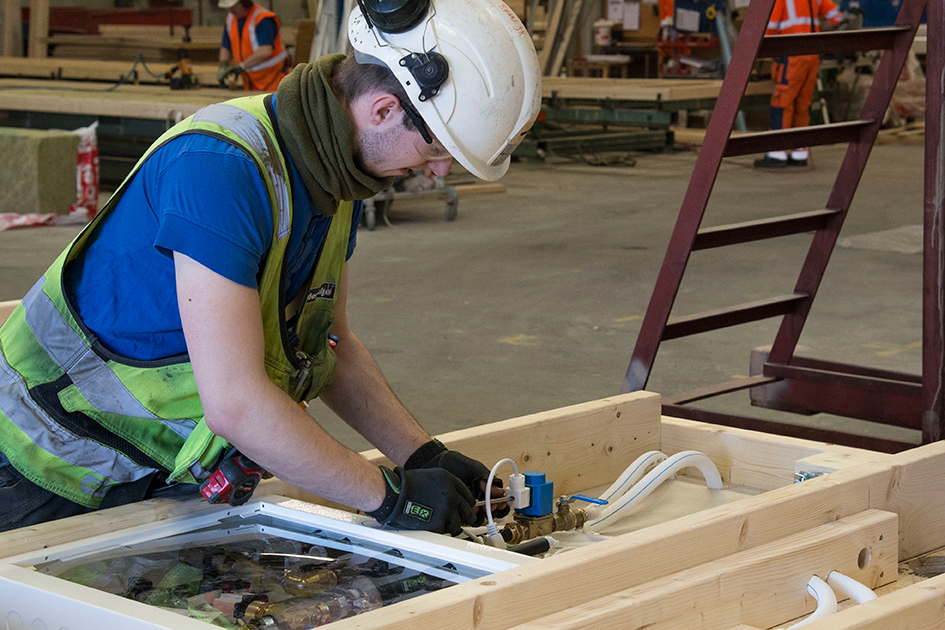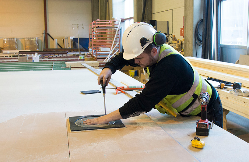 RørTek Steinkjer er allerede på plass med fire mann pr. i dag for å bistå med rørlegging i modulproduksjonen som foregår på selve fabrikken. Her lages 2,7 komplette fengselsceller pr. dag, fra enkeltvegg og gulv til ferdige rom med bad, vannbåren varme-system og røropplegg.