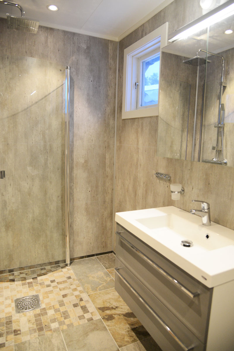 Gulvflise er av type Konradssons kakel. På veggene ble det lagt baderomsplater av typen Cracked Cement M66 fra Fibo Trespo, det ble installert baderomsinnredning fra Foss Bad med servantbatteri Rowan og Aktia komplett takdusjpakke ble satt opp sammen med et firkanta dusjhjørne. Den vegghengte doen, Gebrit Monolith, ble installert med sisterne i glass.