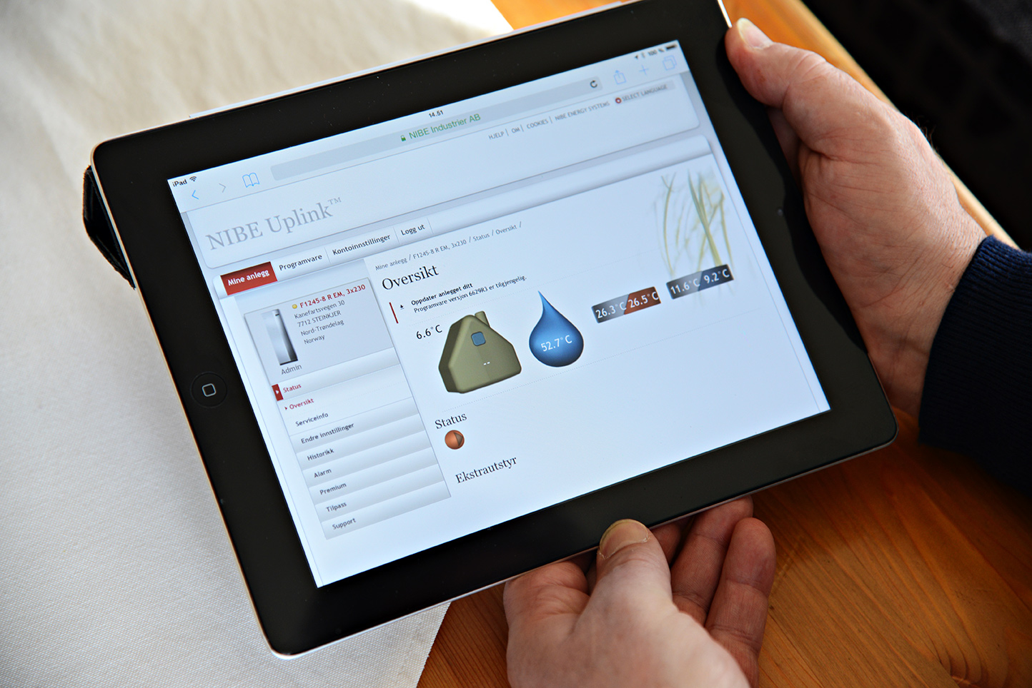 - Roy Grøttheim kan selv styre varmeanlegget trådløst fra nettbrett el. data. Han får hele tiden oversikt over strømforbruk via Nibe.