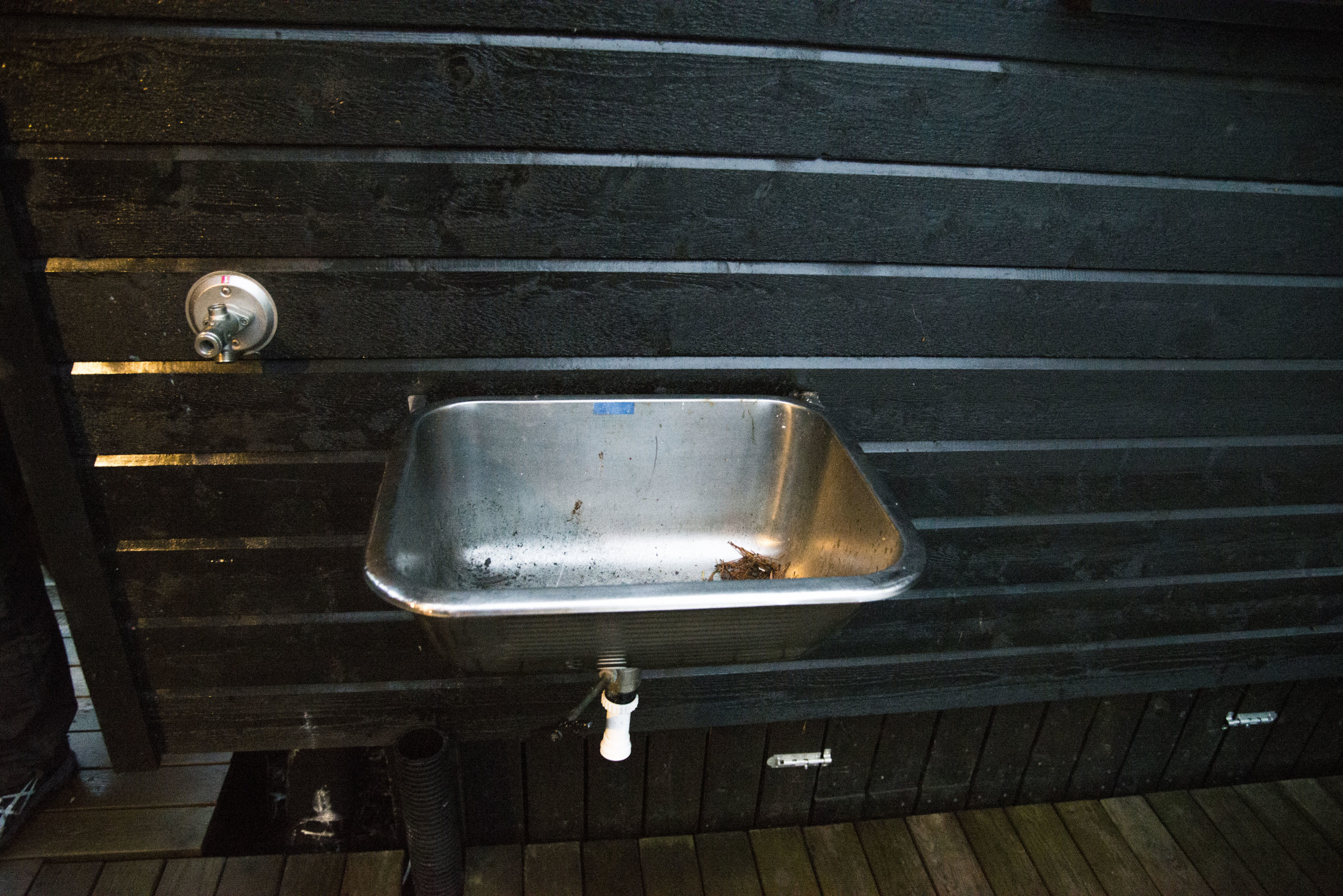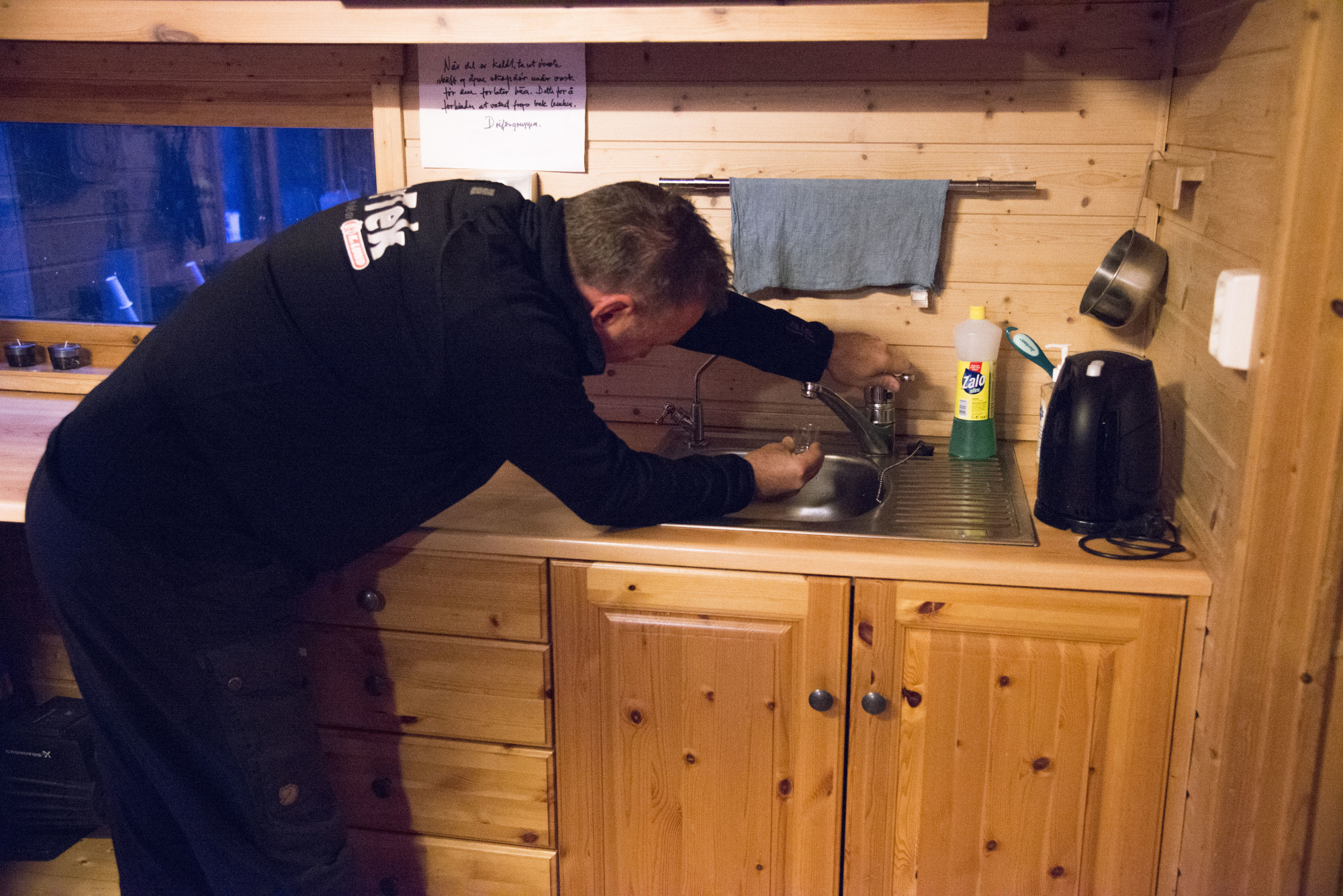 Mens han er på inspeksjon, tar han like gjerne og fyller et lite glass av vannet som er i springen inne på kjøkkenet. Fargen på vannet er langt fra blank.